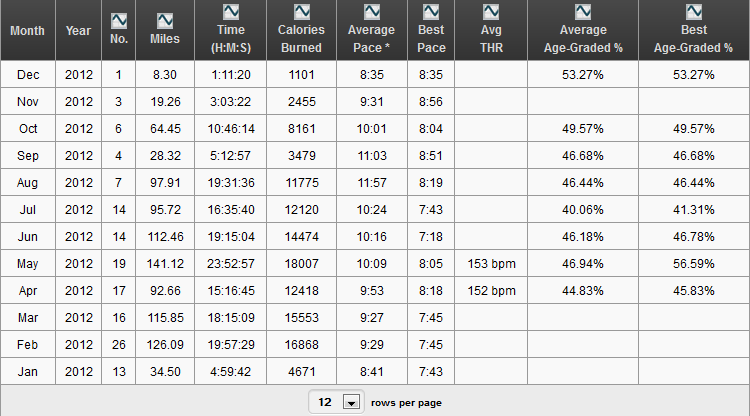 Runs 2012 December 30, 2012 750 × 416 Running stats for 2012 This table details my runs on a monthly basis showing info like total distance anc calories burnt