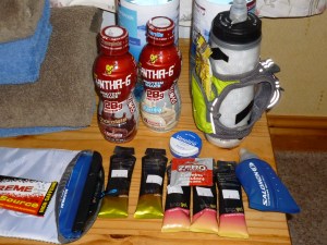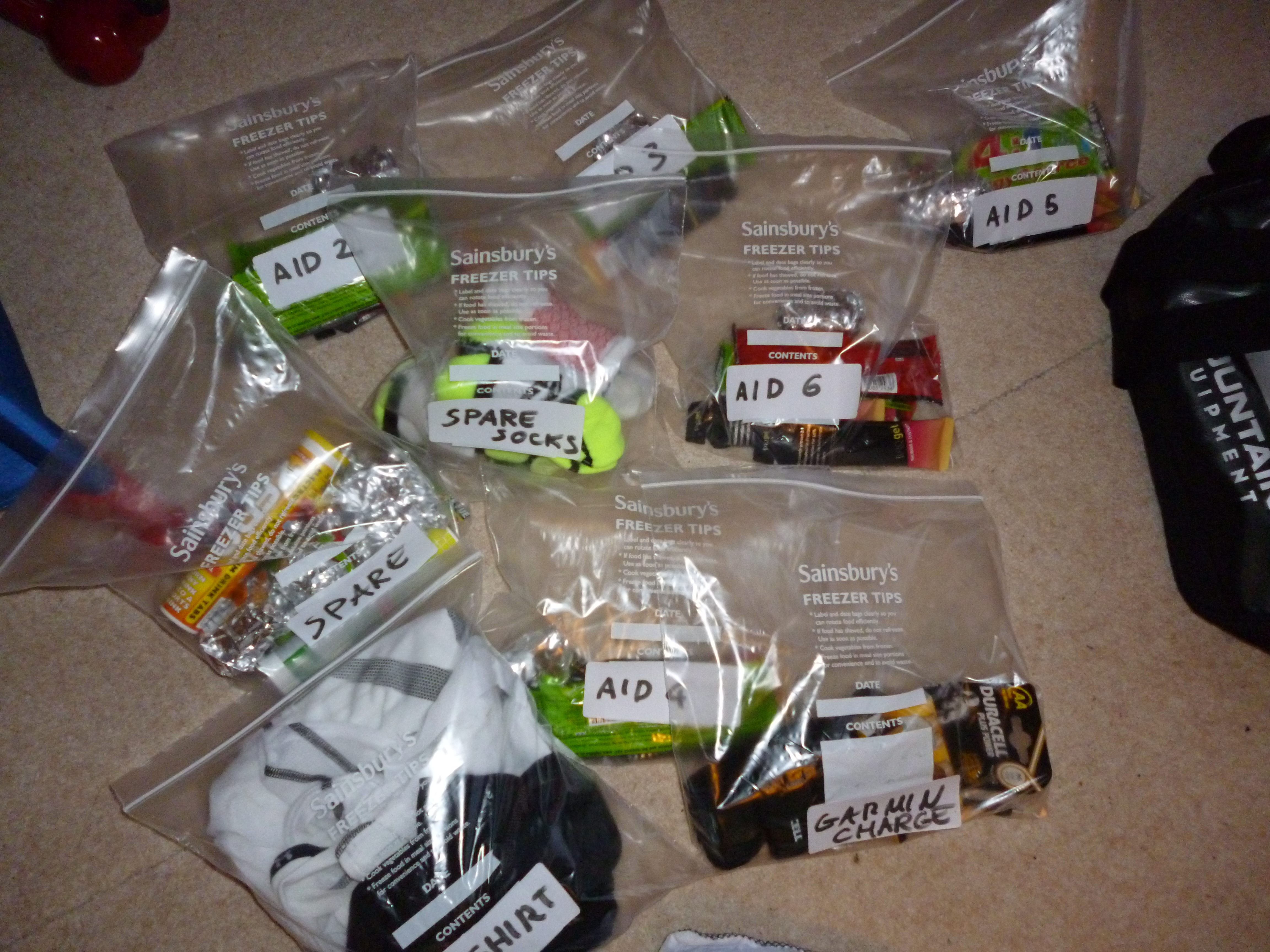 My aid station bags all labelled ready for Gareth to hand to me as needed
