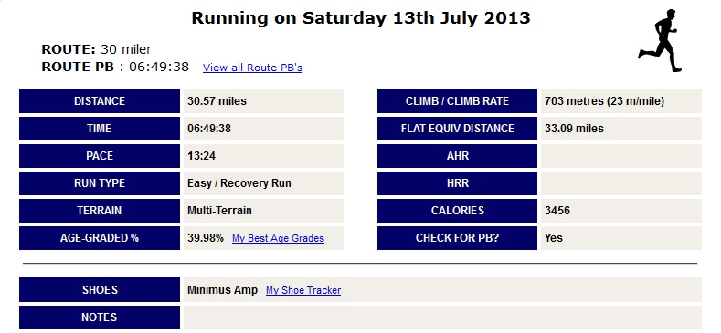 Another positive of this run was the fact that this was the first run in my new New Balance Minimus Amp (MT1010) trainers and they performed admirably, no sore points at all. To run this distance in a new shoe and come out unscathed is a big plus and these are the trainers I will be tackling the 100 in.